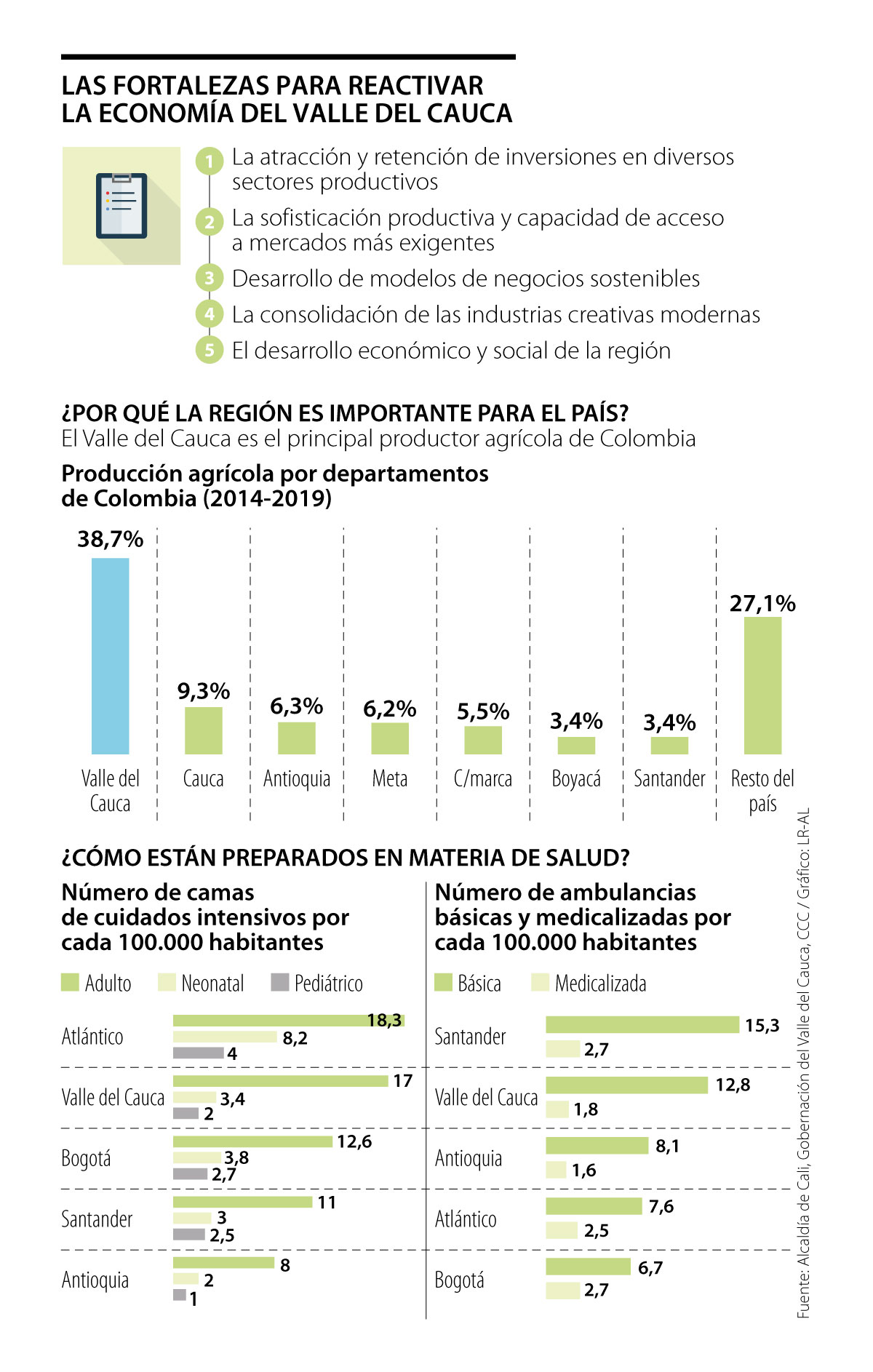 En cuanto al desarrollo del sistema de salud, el informe explica que el Valle es el segundo departamento con el mayor número de camas de cuidados intensivos para adultos por cada 100.000 habitantes (17) después de Atlántico.