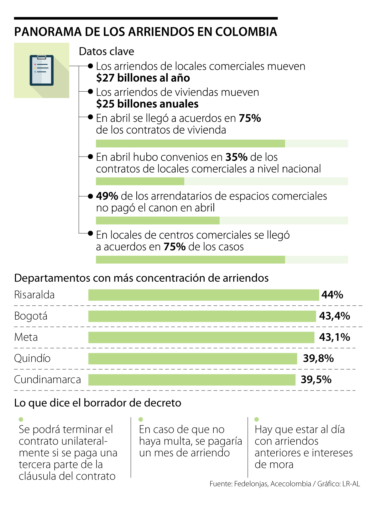 A lo que se suma que, en caso de que no exista una cláusula penal en el contrato, “el arrendatario solo será obligado al pago del valor correspondiente a un canon de arrendamiento”, puntualiza el borrador de decreto de la cartera de Comercio.
