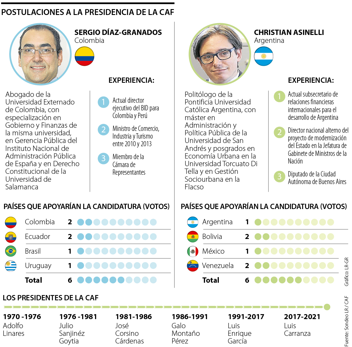 En lo que se refiere a los perfiles de los candidatos a la presidencia de la CAF, Díaz-Granados es abogado de la Universidad Externado de Colombia, se desempeñó como ministro de Comercio, Industria y Turismo entre 2010 y 2013, y actualmente es el director ejecutivo del Banco Interamericano de Desarrollo (BID) para Colombia y Perú.