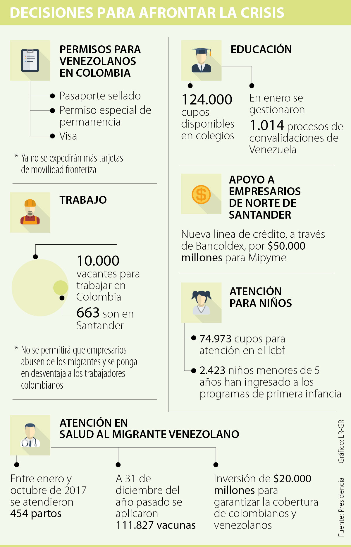 Tras una reunión en Cúcuta con gran parte del gabinete de ministros, funcionarios del gobierno, autoridades regionales, líderes de gremios, empresas y mandos militares; el Presidente Juan Manuel Santos anunció una serie de medidas para afrontar la crisis humanitaria que se vive en la frontera y en otras zonas del país por cuenta de la inmigración de venezolanos.