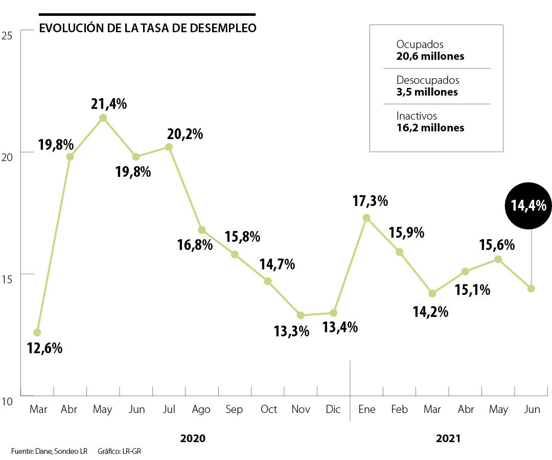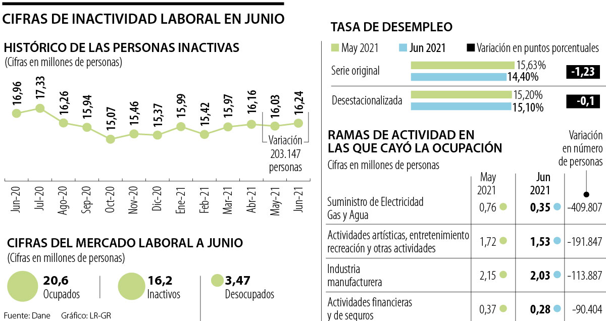 De hecho, si se comparan las cifras desestacionalizadas, en junio la tasa de desempleo solo cayó 0,1 puntos porcentuales frente a mayo, pues pasó de 15,2% a 15,1%. Según lo explicó la Dirección de Investigaciones Económicas de Bancolombia a LR, esa disminución estaría explicada por el aumento de la inactividad y no por una mejoría sustancial en la reactivación del mercado laboral.