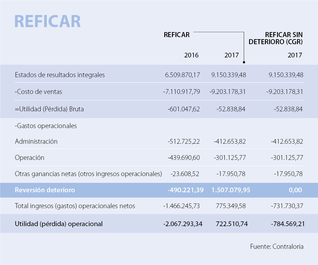 Luego de realizar el estudio del ajuste, el ente de control también cuestionó la rentabilidad de la compañía. "Dejando atrás el ajuste de reversión del deterioro, en el estado de resultados se aprecia que la refinería continúa dando pérdidas. Para la vigencia 2017 esta ascendió a $52.838 millones, debido a que el costo de ventas sigue siendo mayor que los ingresos operacionales".