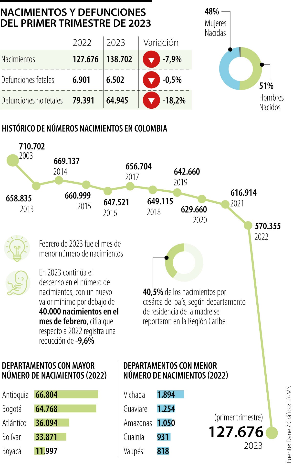 Desde 2018, el Dane ha venido registrando una caída en el número de nacimientos en Colombia y en 2022 se registró la baja más fuerte. La entidad evidenció que en el país nacieron 570.355 personas y esta cifra es 7,5% menos que la registrada en 2021. Acá el Dane alertó que es un decrecimiento histórico, pues las caídas en número de nacimientos cada año habían rondado entre -2,1% y -1,0%.
