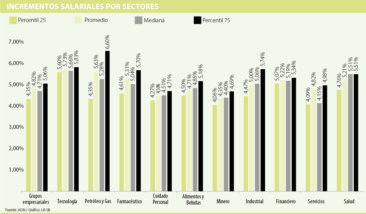 De acuerdo con el informe de Aon, los salarios de los empleados del sector petrolero fueron los que más aumentaron, a un promedio de 6,6%, seguido por trabajos en tecnología (5,83%) , industrial (5,74%) y sector farmacéutico, con una subida salarial de 5,70%.