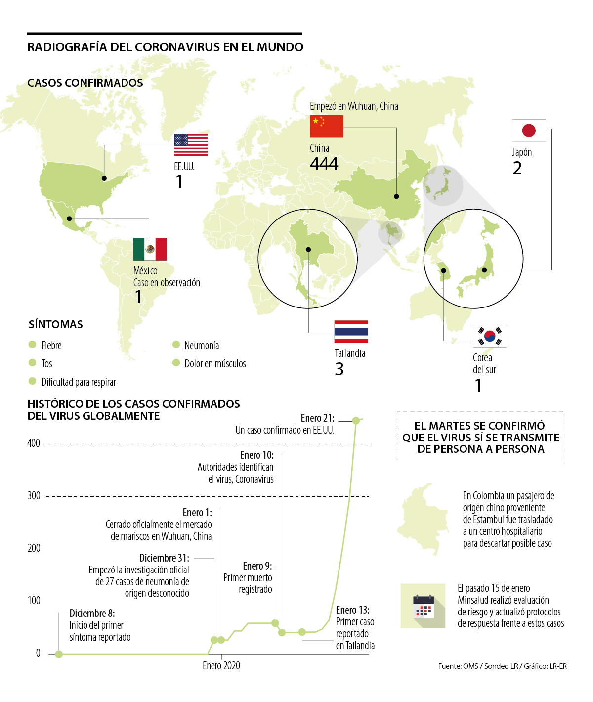 “El pasado 15 de enero el Ministerio realizó una evaluación de riesgo y actualizó sus protocolos de respuesta frente al manejo de este tipo de casos. Dentro de los procesos rutinarios de vigilancia y atención, se están aplicando los protocolos para la detección y tratamiento de pacientes con Infección Respiratoria Agua Grave (IRAG)”, señaló la cartera de salud en un comunicado. Además, como medida preventiva se ha comunicado a las personas que salen de Colombia con destino a Asia, acudir al servicio de salud si llegan a sentirse enfermos durante el viaje o después del mismo, e informar a los servicios de salud locales cuáles fueron las zonas que han visitado.