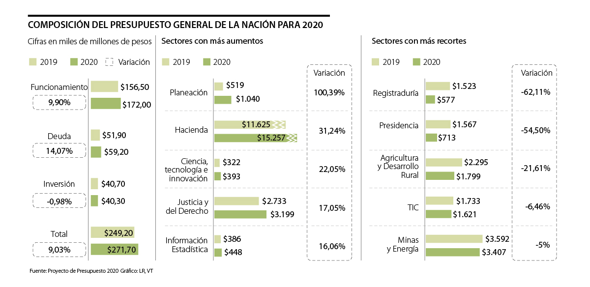 En total, para la vigencia de 2020 se tendrían $22 billones más que el año pasado cuando la carta presupuestal llegó a $249 billones. Además, el funcionamiento pasará de $156 billones a $172 billones (9,9%) y la deuda de $51 billones a $59 billones (14,2%).