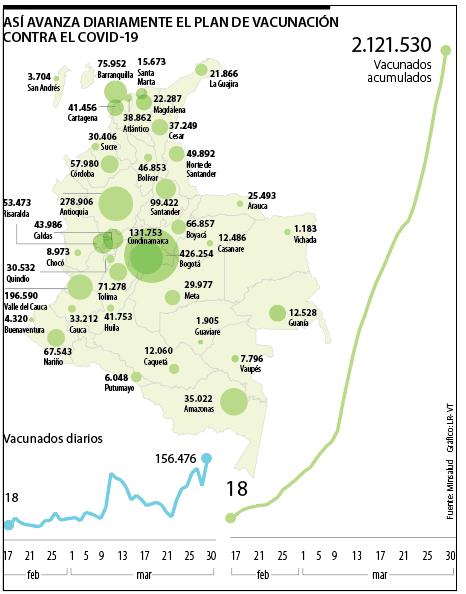 El Plan de vacunación del Gobierno Nacional, que inició con una fase enfocada en los mayores de 80 años y el personal de primera línea de la salud, ha venido cumpliendo con las fechas establecidas, pues en el momento que el país estaba por llegar al millón de vacunados, el ministro de Salud, Fernando Ruiz, informó que antes de finalizar marzo se iban a lograr las dos millones de inoculaciones, tal y como ocurrió al corte del 30 de marzo, con el último reporte de la cartera que informó que, en total, fueron 2.121.530 dosis aplicadas.