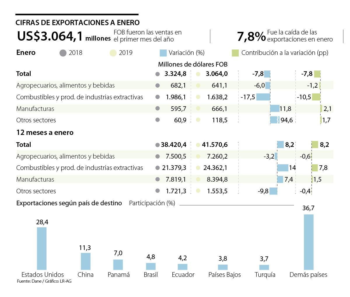 Aunque las cifras de este grupo se mantuvieron a la baja, Lloreda explicó que se espera que “se presente un mejor comportamiento en las exportaciones del sector al cierre de este trimestre”. Es importante resaltar que en este grupo de combustibles las ventas fueron de US$1.638,2 millones en enero, cifra que representó la caída de 17,5% frente a enero de 2018.