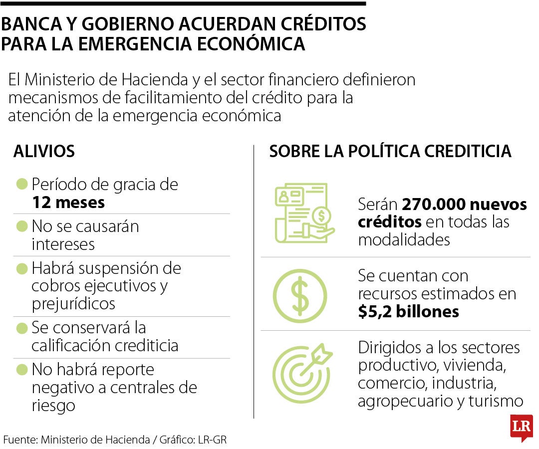 En materia de los nuevos créditos, el sector bancario propuso un incremento de 15% en el número de créditos y en el monto total de recursos. Para lograrlo, el Gobierno se comprometió a dar garantías de hasta 90% y recursos de redescuento a los bancos para ofrecer tasas al menos 50% inferiores a las actuales.