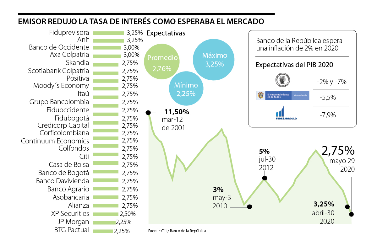 Con la reducción de 50 puntos básicos, la tasa de intervención llegó a su punto más bajo en la historia, muy por debajo de 3% que se dio en mayo de 2010. El gerente general del Banco de la República, Juan José Echavarría, explicó que esta determinación es el reflejo de las condiciones por las que atraviesa el mercado, que ya vislumbra el peor segundo trimestre de la historia, así como un deterioro en la confianza del consumidor.