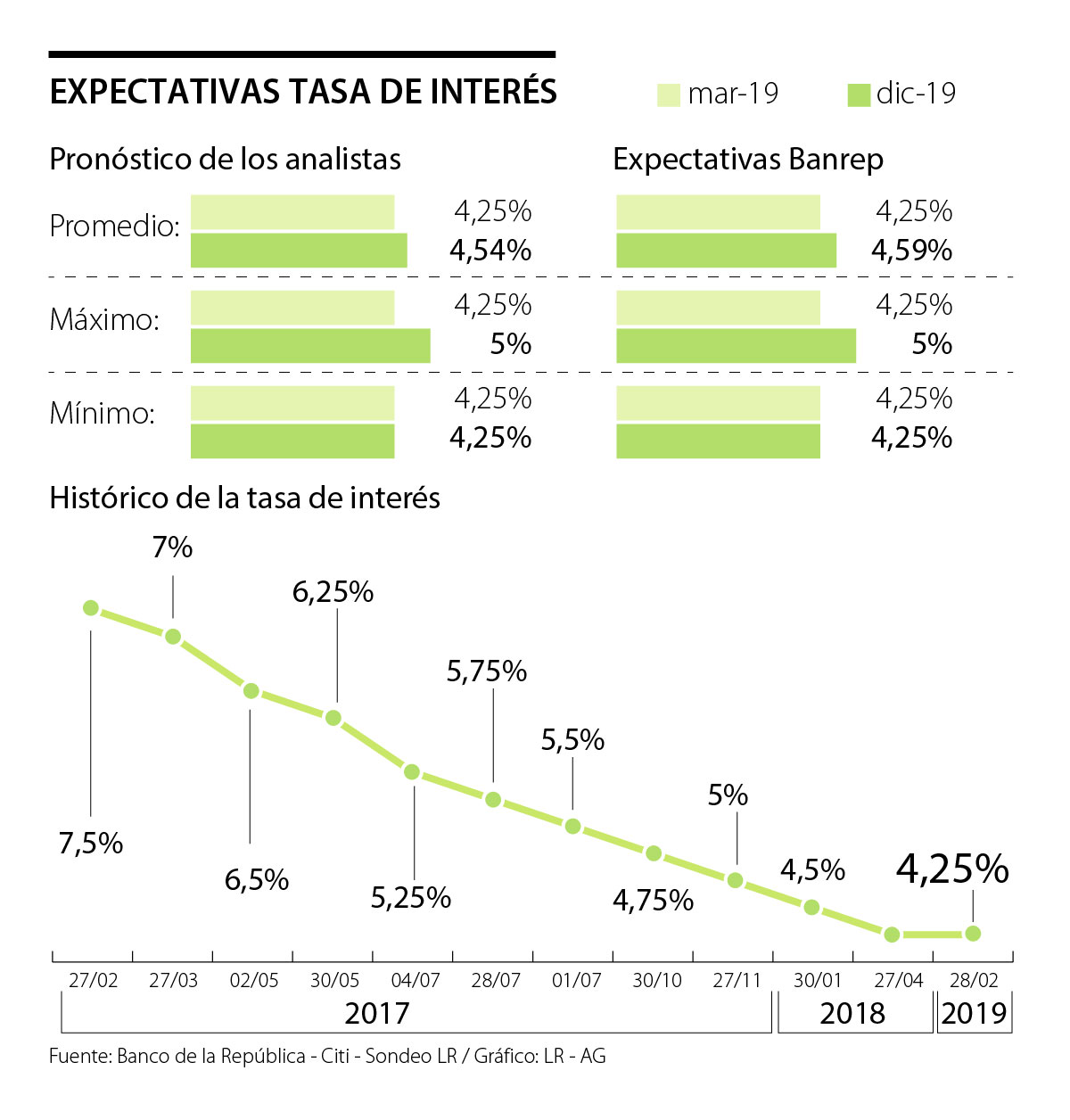 Dos días después de que la Reserva Federal (Fed) decidiera mantener inalteradas las tasas de interés en EE.UU., la Junta Directiva del Banco de la República se reunirá nuevamente hoy, bajo un clima de consenso en el mercado, que pronostica que la tasa de intervención seguirá inalterada a un nivel de 4,25%, el mismo que mantiene desde abril de 2018. Con este resultado, se completan 11 meses en los que los tipos de interés permanecen intactos, el periodo más estable de los últimos cuatro años.