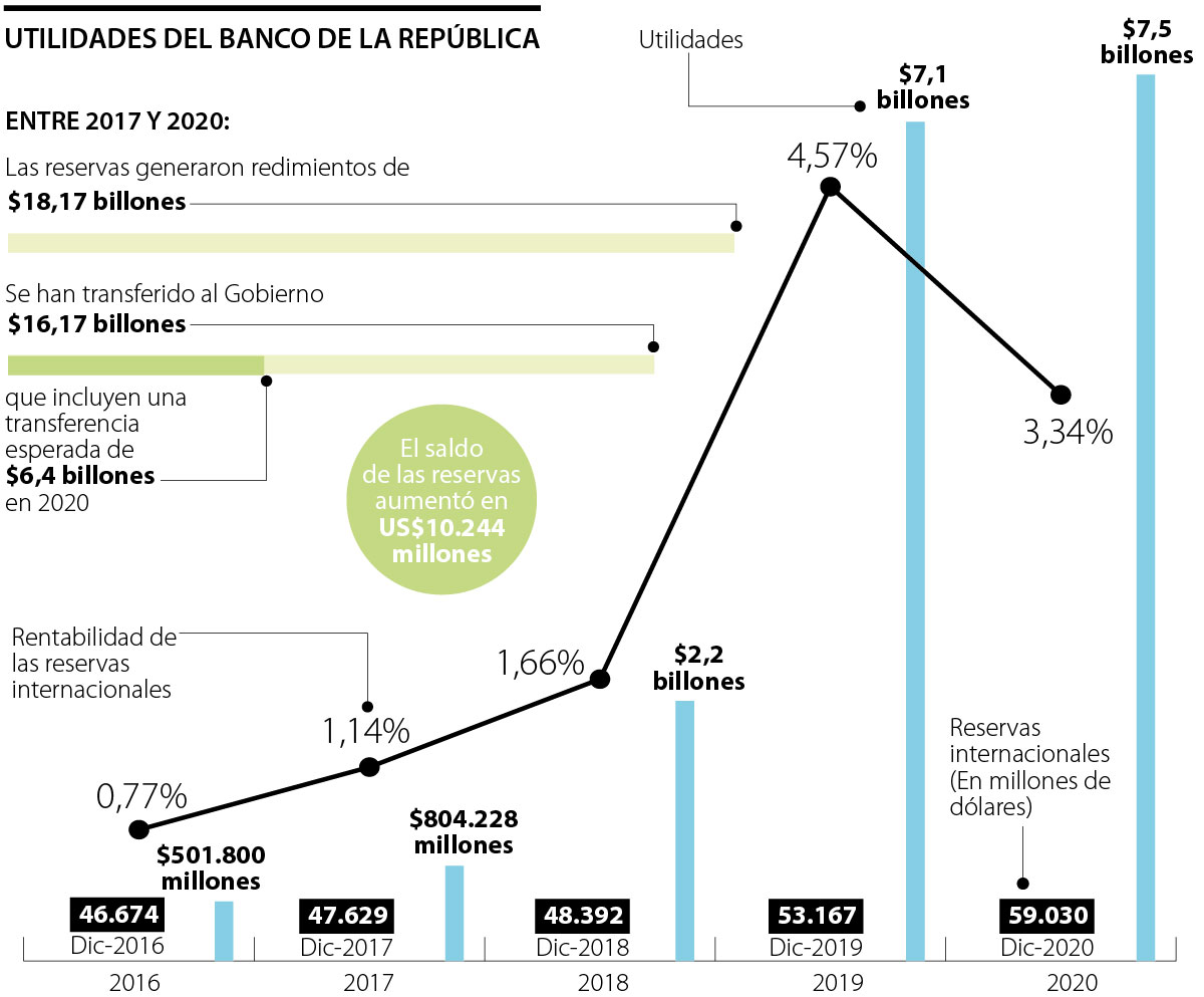 De los $7,5 billones de utilidades, el Emisor estima transferirle al Gobierno una suma que ronda $6,4 billones, que es menor a la cifra de $6,9 billones que se transfirieron en 2019.