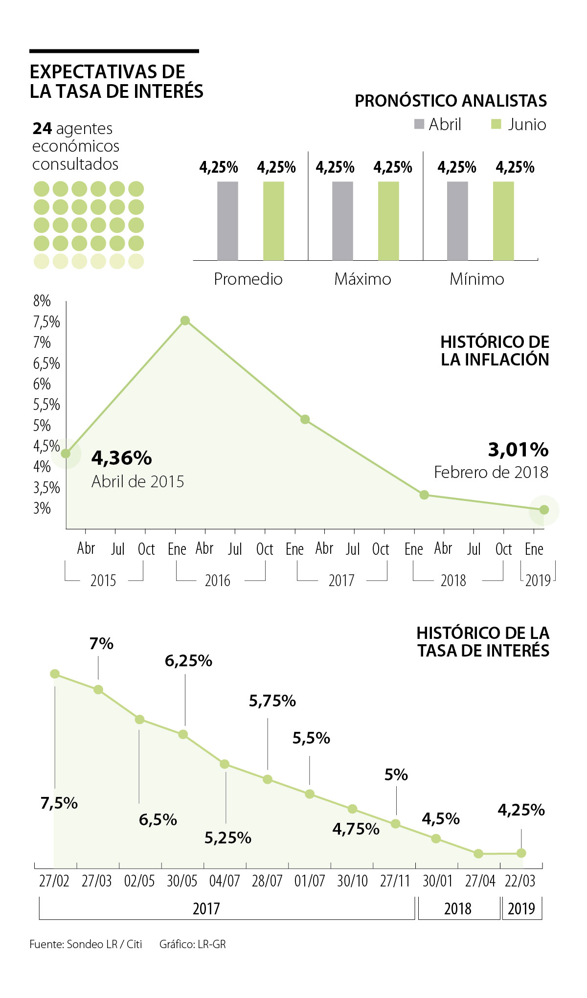 En la más reciente junta del Banco de la República, el gerente general, Juan José Echavarría, aseguró que las condiciones del mercado garantizan que se pueda mantener la tasa de interés. En ese momento, Echavarría sostuvo que estaría satisfecho si los tipos se dejan quietos por unos meses. En el mismo anuncio, la junta aseguró que este año será de recuperación, por lo que para final de 2019 la proyección de crecimiento de la economía la estiman en 3,5%, muy por encima de lo que espera el mercado, con 3,26%.
