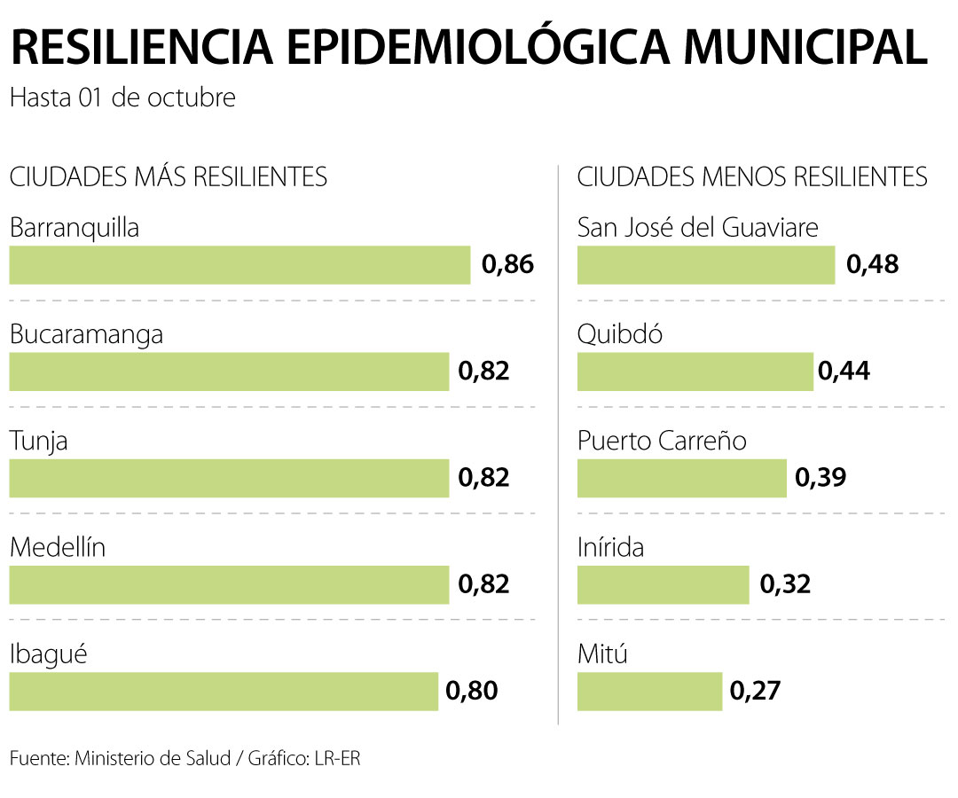 Mientras que Ibagué logró 0,80, pero también superando 0,75 de la resiliencia está Neiva y la capital del país, Bogotá con 0,77, y Armenia con 0,74. "Ocho ciudades por encima del 75% y 27 sobre el 50%. Las claves son los avances en la vacunación y el control de contagios", reiteró el Ministro de Salud Fernando Ruiz.