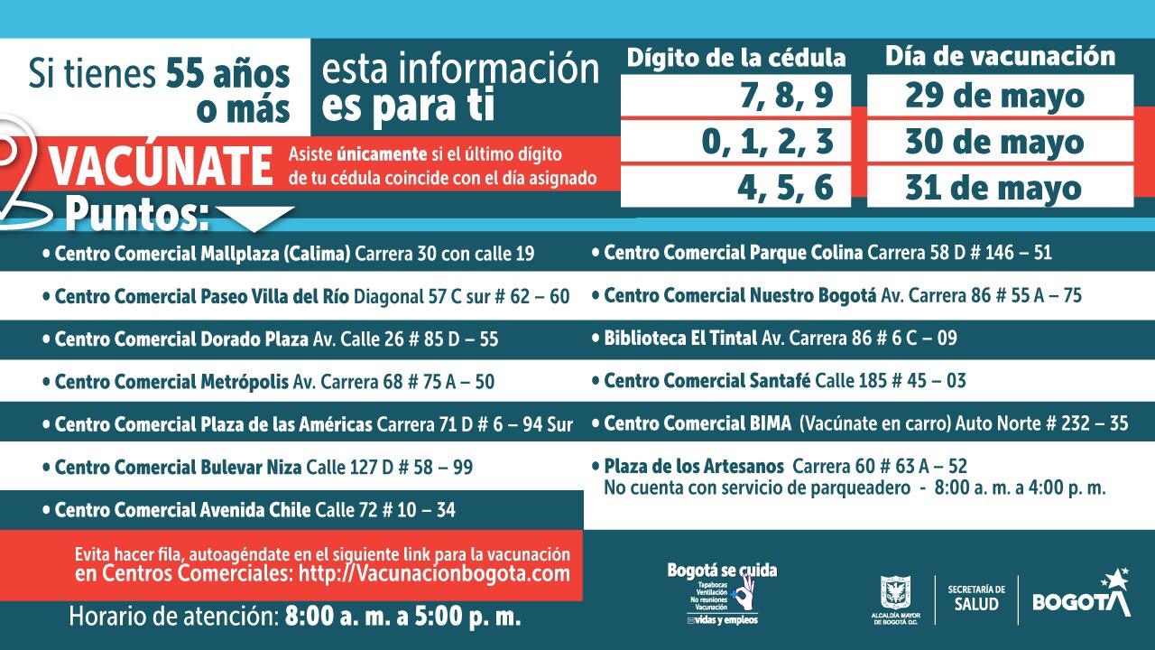 La Secretaría de Salud de Bogotá anunció en un comunicado que amplió los puntos de vacunación contra el covid-19 en 13 centros comerciales de la capital para las jornadas del sábado 29, domingo 30 y lunes 31 de mayo, con el propósito de agilizar el proceso de los adultos mayores de 55 años que aún no estén inmunizados.