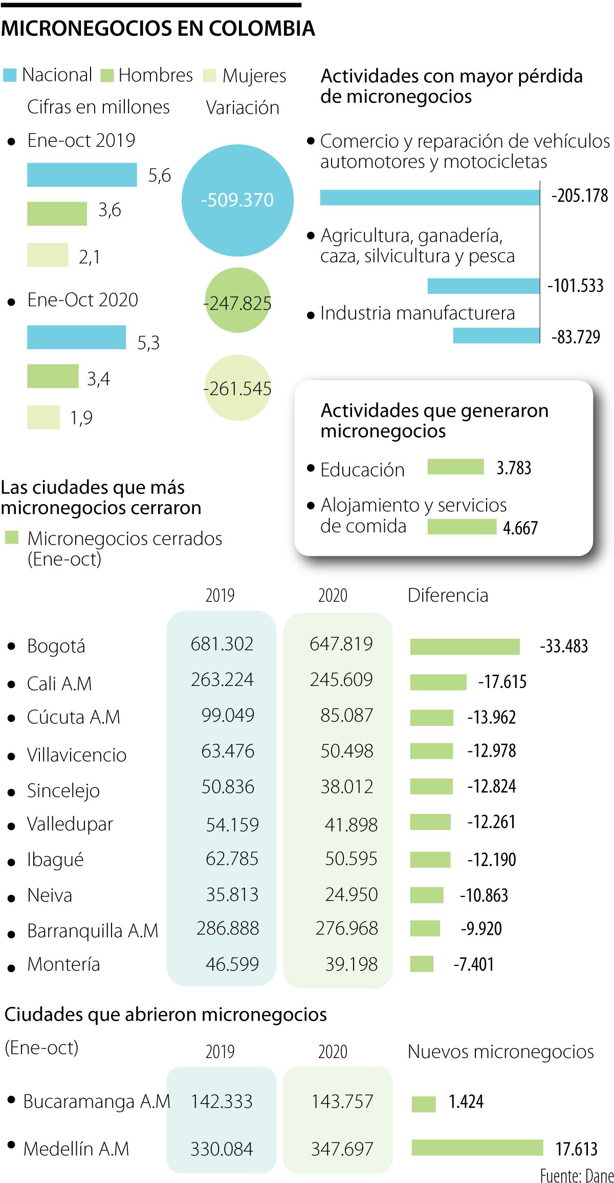 Según el Dane, debido a la crisis generada por la pandemia, de esa salida de micronegocios en términos de empleo, se vio una disminución de más de un millón de personas ocupadas. Así las cosas, en los 10 primeros meses de 2020, los micronegocios del país ocuparon a 7,2 millones de personas, de los cuales 5,3 millones eran propietarios (74,2%) y 954.000 eran trabajadores que recibieron un pago.