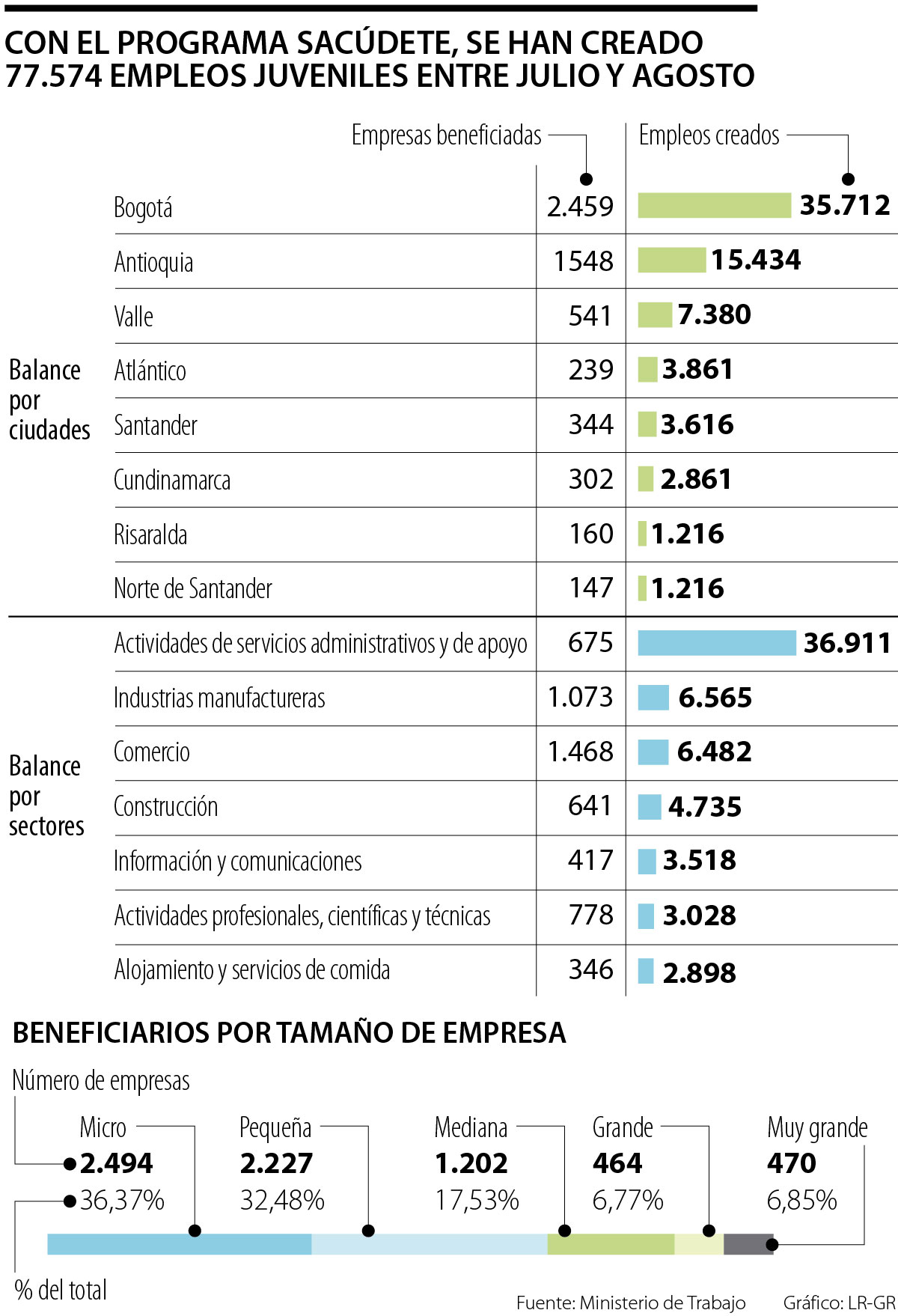 En julio entró en vigencia el programa Sacúdete, que da un subsidio de 25% de un salario mínimo por cada joven que contraten las empresas. En dos meses de funcionamiento, el Gobierno ha invertido más de $23.000 millones, con los que se han creado 77.574 empleos juveniles.