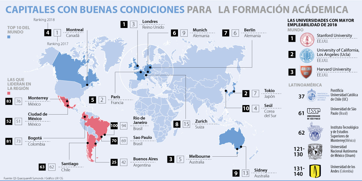 Por su parte, la mexicana Monterrey aparece como la sexta ciudad para estudiar de la región y la carioca Río de Janeiro como la séptima de la lista.