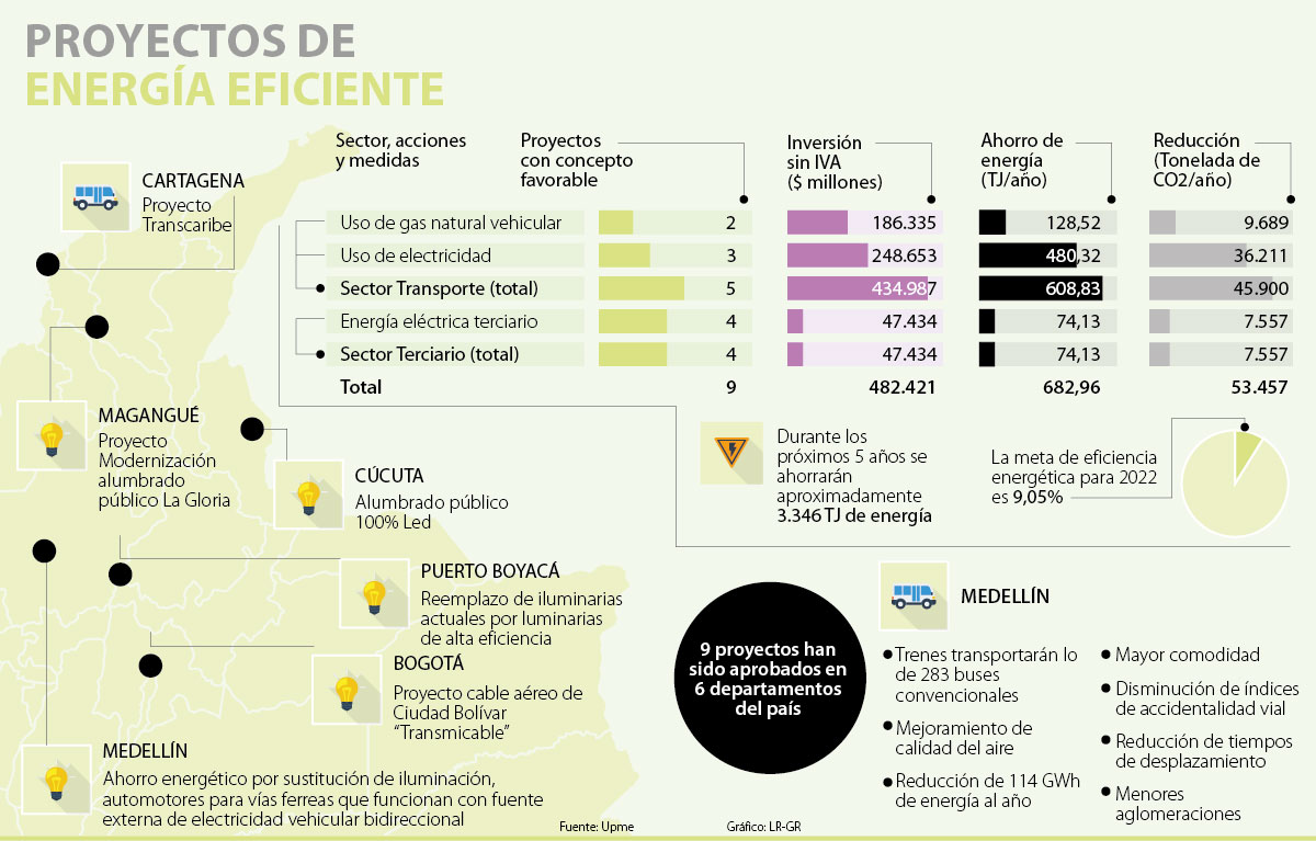 De estos, cinco son proyectos para el sector transporte y los otros cuatro son para el sector terciario. Los de transporte se dividen en dos que harán uso de gas natural vehicular y tres que harán uso de electricidad. En cambio, los del sector terciario consisten en modificar el alumbrado público por iluminación más eficiente, como luces led.