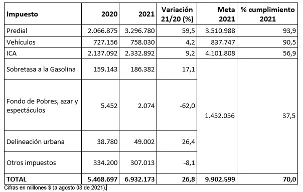 Los recursos significan 27% más que lo recaudado a julio de 2020. Se destaca el Impuesto Predial, con $3,3 billones de recaudo