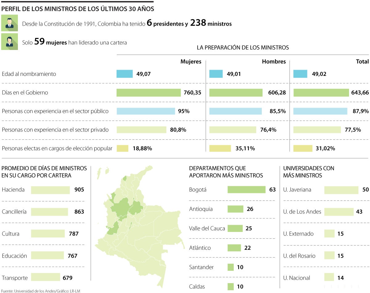 Un estudio de la Escuela de Gobierno de la Universidad de los Andes clasificó el perfil más común que suelen tener los ministros de Colombia desde la creación de la Constitución de 1991.