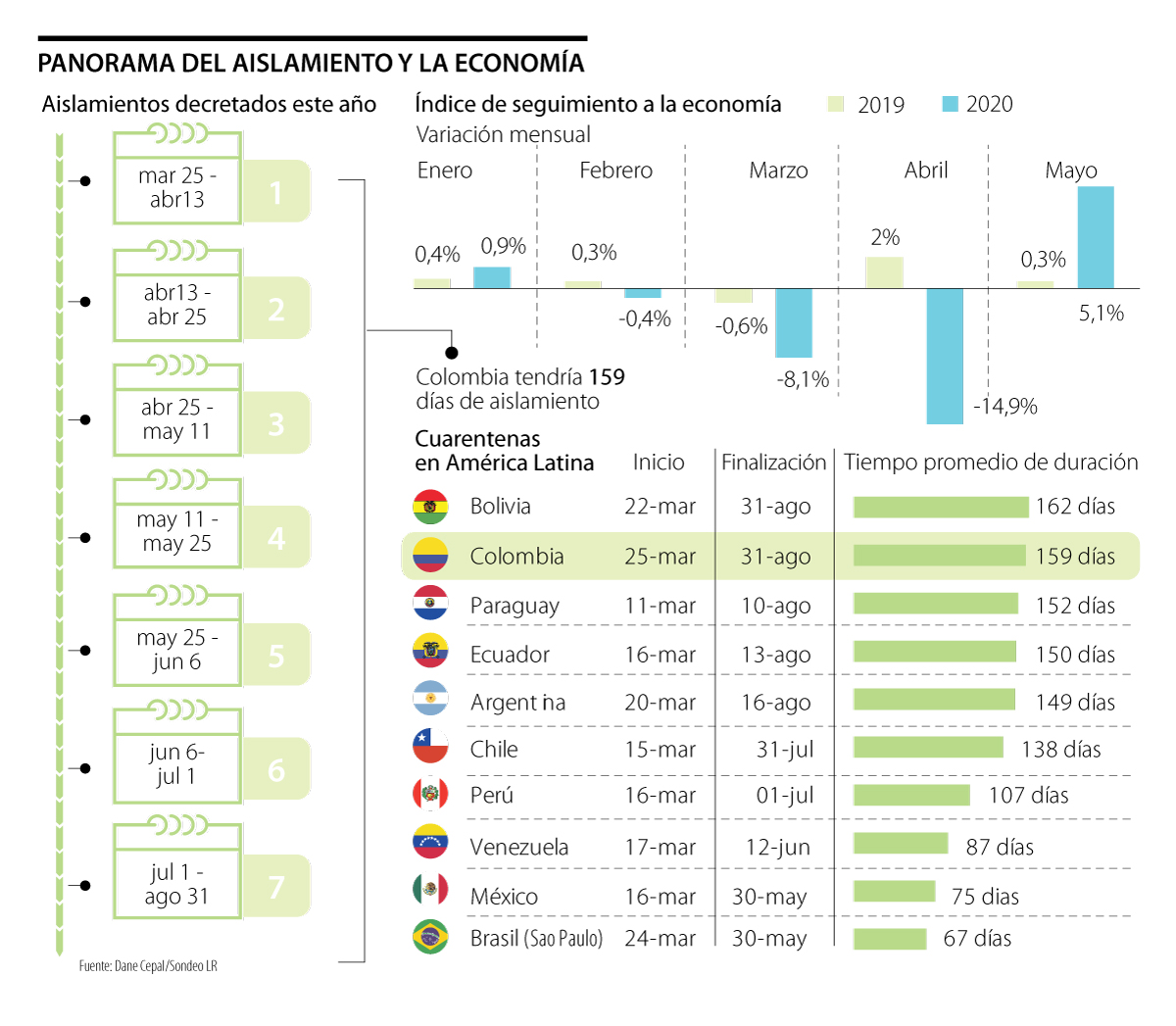 El Gobierno se sigue enfrentando a un dilema, pues el PIB ha caído a mínimos históricos, y en abril el Indicador de Seguimiento a la Economía del Dane, tocó fondo al llegar a -20,5% y en mayo a -16,7%, comparado con el mismo periodo de 2019. Además, el desempleo que, venía con cifras preocupantes en enero y febrero, no ha dado tregua y en abril se evidenció que 5,3 millones de personas perdieron su empleo frente al mismo periodo del año pasado. En mayo la cifra fue 4,9 millones.