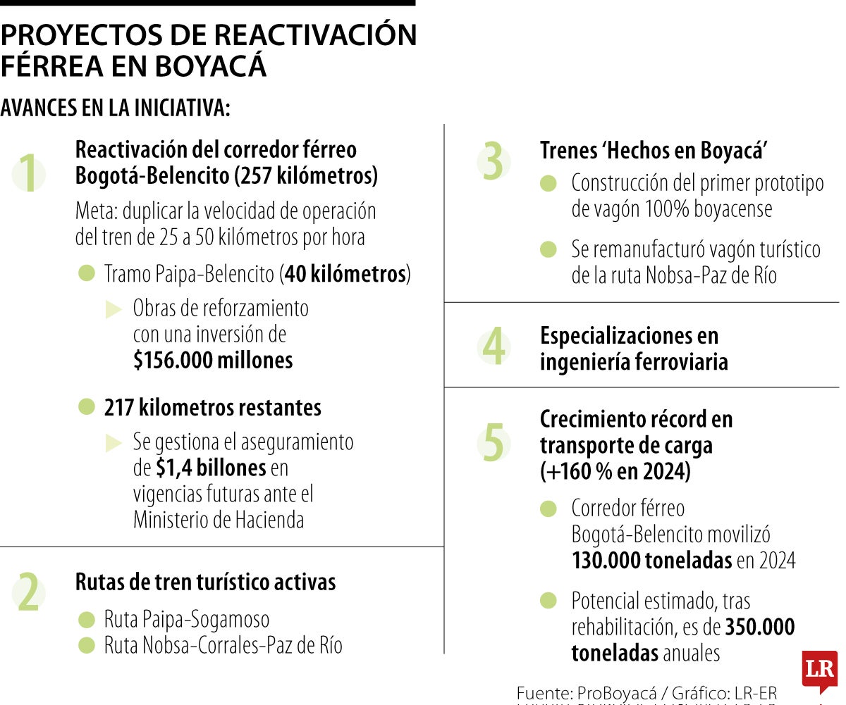 ProBoyacá señaló que Boyacá avanza en proyectos de reactivación ferroviaria, destacando como una de las principales iniciativas la recuperación del corredor férreo Bogotá–Belencito, con una extensión de 257 kilómetros. En este tramo, la meta es duplicar la velocidad de operación del tren, pasando de 25 a 50 kilómetros por hora.