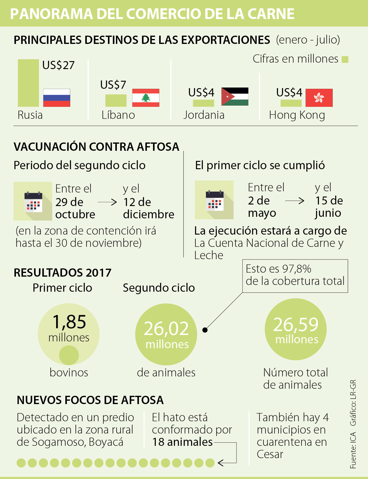 Los brotes reportados de fiebre aftosa en Boyacá y César ya dejaron las primeras consecuencias para el comercio exterior de carne. La decisión de la Organización Mundial de Sanidad Animal (OIE) de suspender el estatus sanitario trajo consigo el cierre del principal mercado para este producto, como es Rusia, que pesa 60% de las exportaciones.