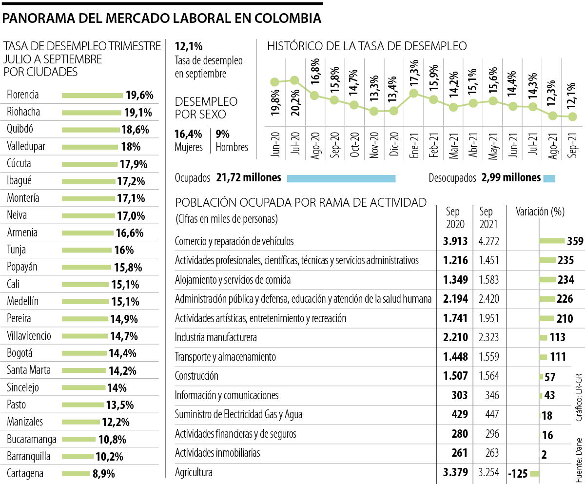 En la desagregación por sectores, en los que hubo mayor recuperación de puestos de trabajo comparado con septiembre de 2020 fueron los de comercio y reparación de vehículos; actividades profesionales, científicas y técnicas; y alojamiento y servicios de comida, que tuvieron incrementos en la ocupación de 359.000, 235.000 y 235.000 personas respectivamente.