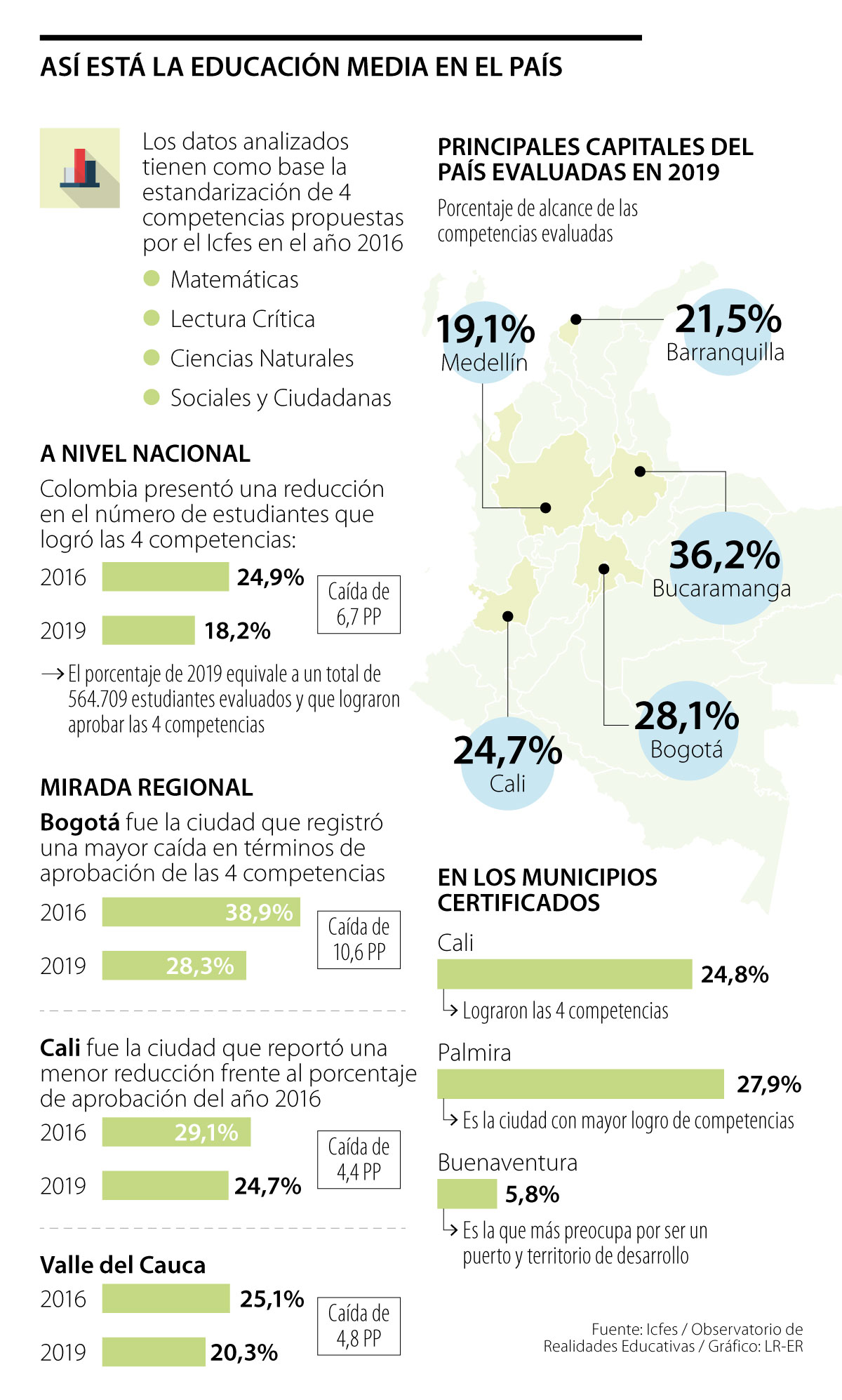 El Observatorio también mostró que entre 2016 y 2019, Cali se mantuvo como la urbe donde con menor variación en términos de aprobación de competencias, con una baja de 4,4 puntos porcentuales sobre los números registrados en ese año; pasando así, de 29,1% a 24,7%.