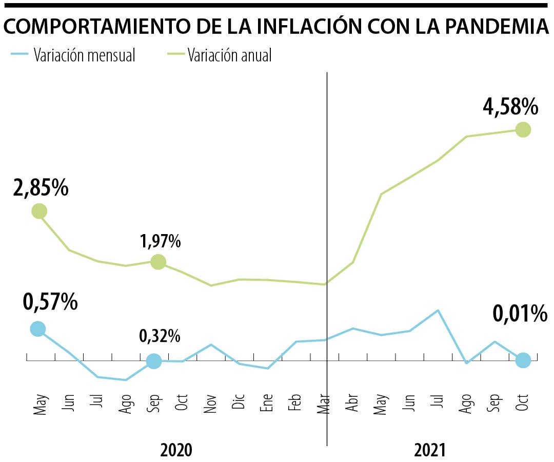 Aunque el dato de octubre muestra una corrección frente a la inflación de septiembre cuando esta se ubicó en 0,38%, la cifra para el décimo mes del año llevó a que la inflación anual subiera a 4,58%, convirtiéndose en el segundo valor más alto que ha visto el Dane desde diciembre de 2008 a la fecha.