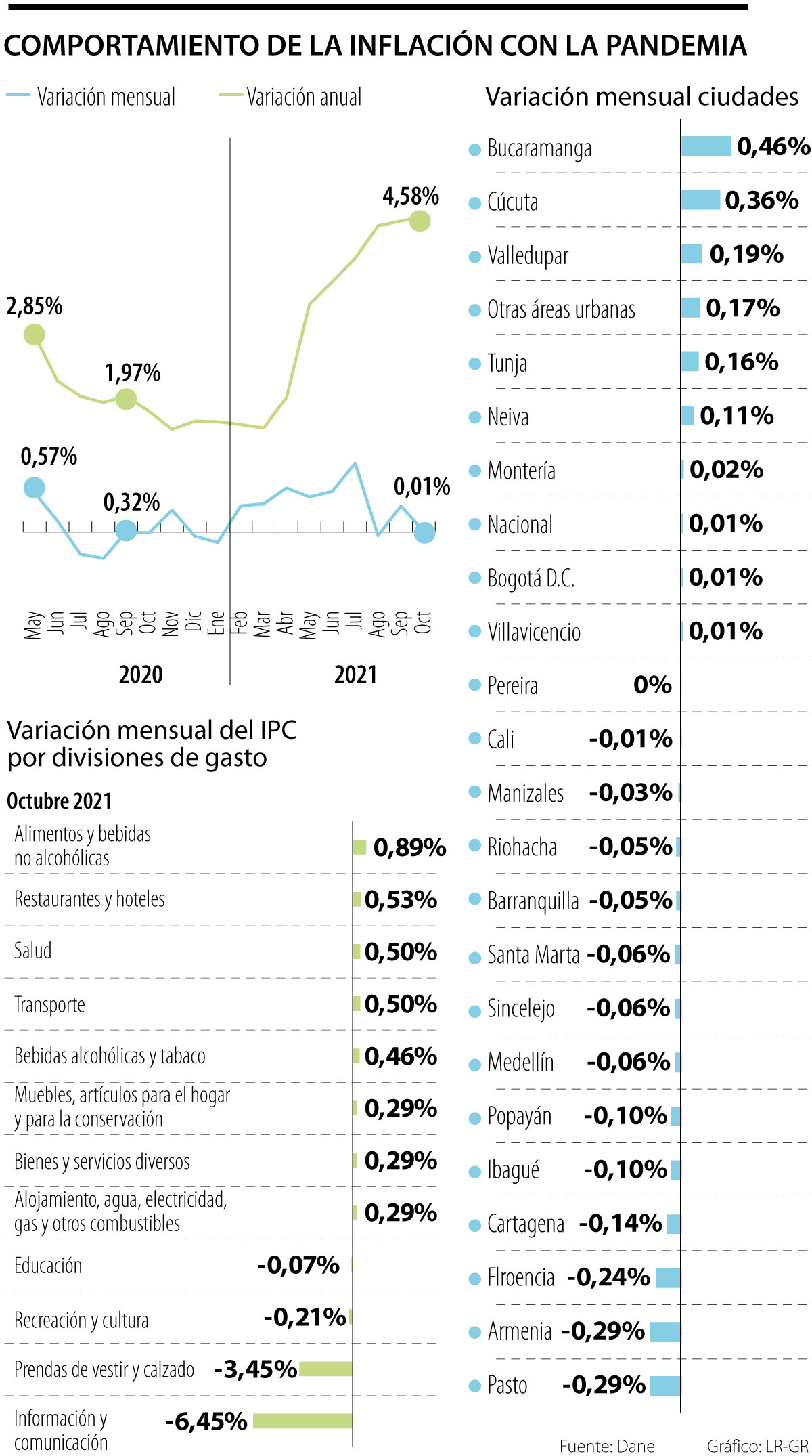 Por ciudades, se observó que Bucaramanga (0,48%), Cúcuta (0,38%) y Valledupar (0,19%) fueron las que tuvieeron la inflación mensual más alta. En contraste, Pasto (-0,29%) y Armenia (-0,29%) tuvieron los reportes más bajos.