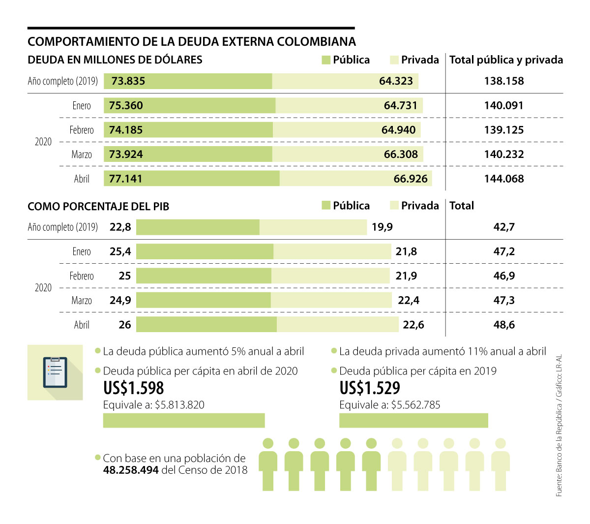 Al revisar únicamente la cifra de la deuda externa pública, que es de US$77.141 millones, esta se incrementó 4,5% comparándola con lo que se debía al cierre de 2019 y subió 5% frente a abril del año pasado.