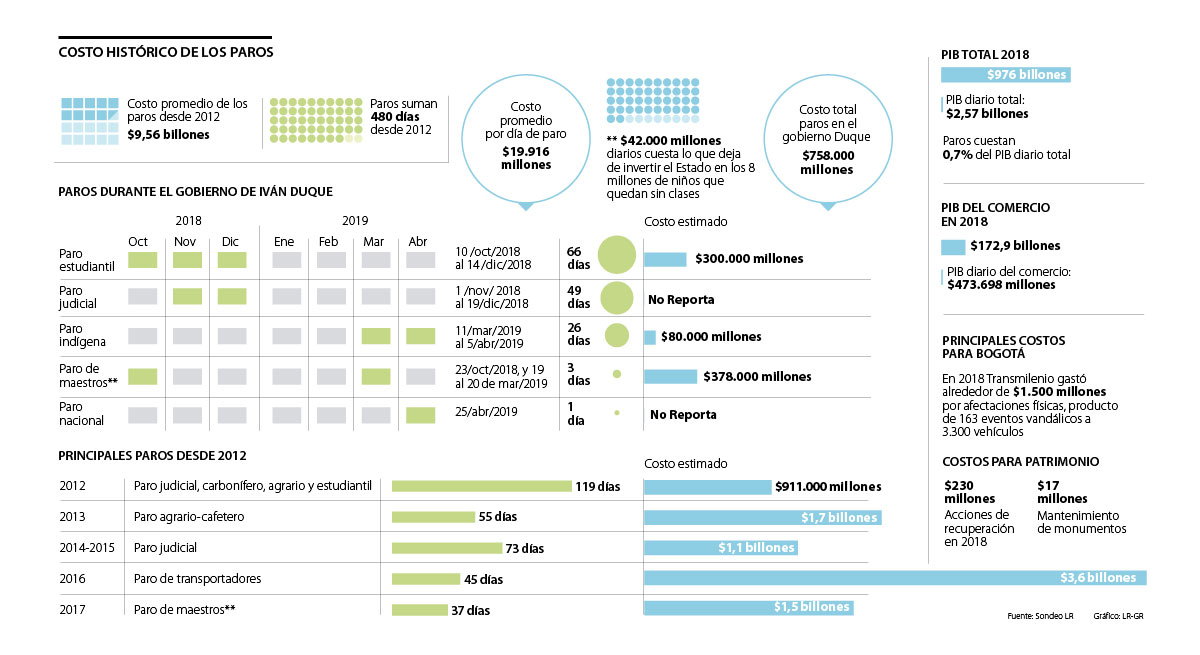 Se estima que desde 2012 los paros le han costado al país alrededor de $9,56 billones y que el costo de un día en promedio de un paro equivale a 0,7% del PIB nacional diario