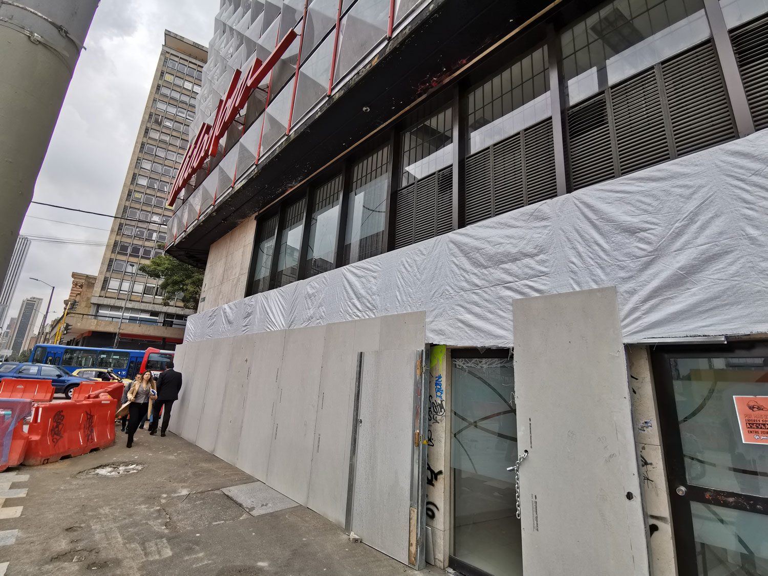 Totalmente irreconocible luce el Banco de Bogotá en la esquina de la Avenida 19 con Séptima, puertas, ventanas y letrero fueron cubiertos.