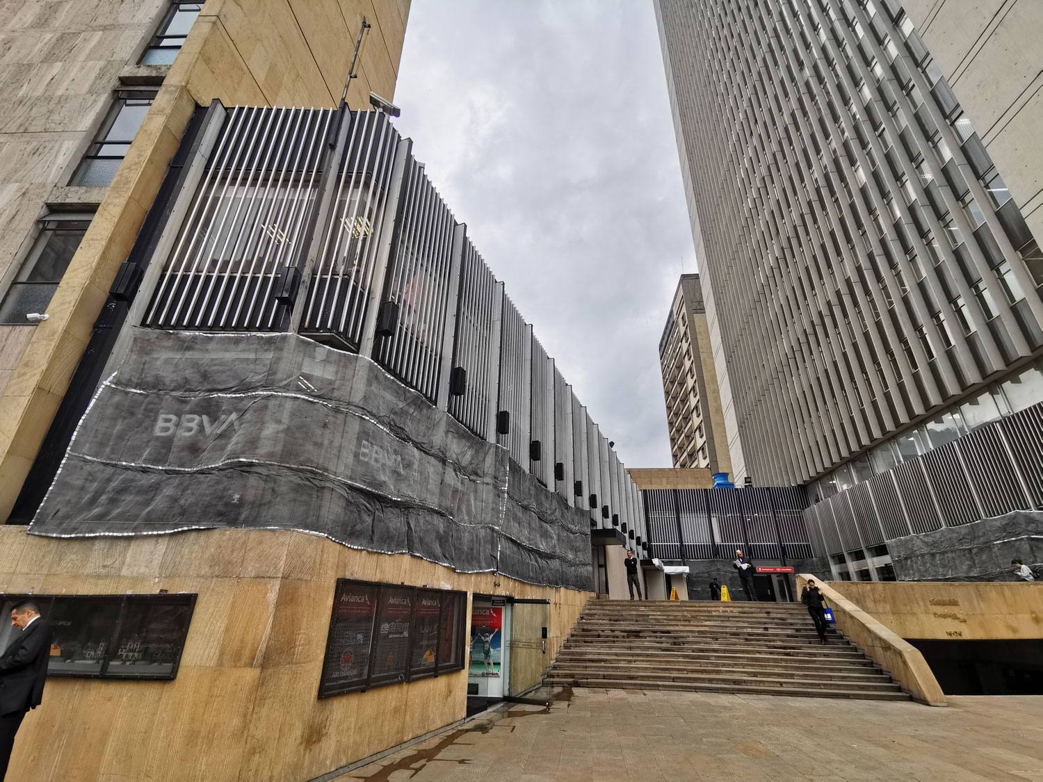 El tradicional edificio de Avianca cubrió sus ventanas y las del banco Bbva con malla para prevenir ataques con pinturas y piedras.