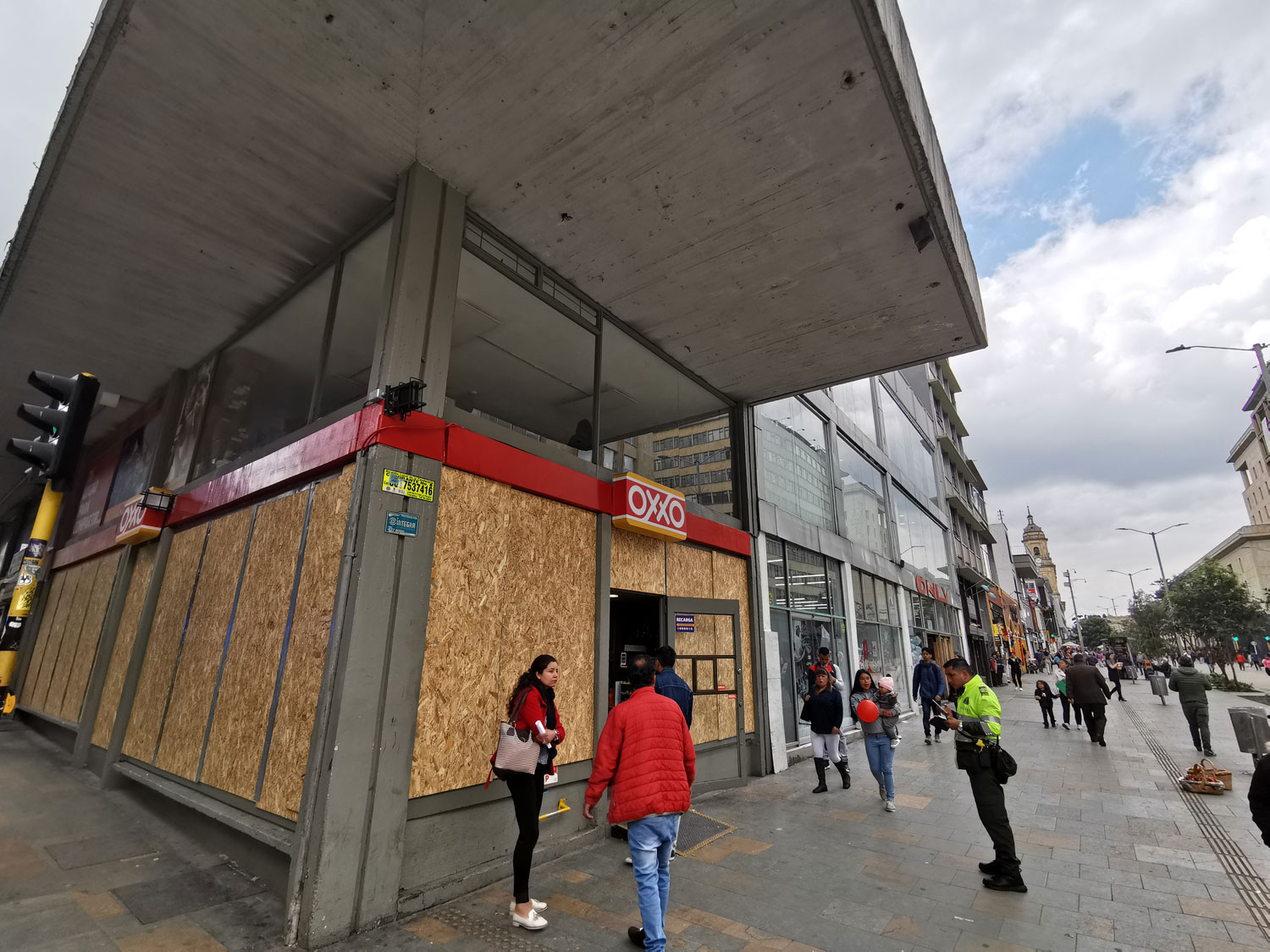 La cadena mexicana Oxxo en algunos locales que quedan sobre la Carrera Séptima en Bogotá cubrió las ventanas y puertas para evitar afectaciones en los vidrios de sus puntos.