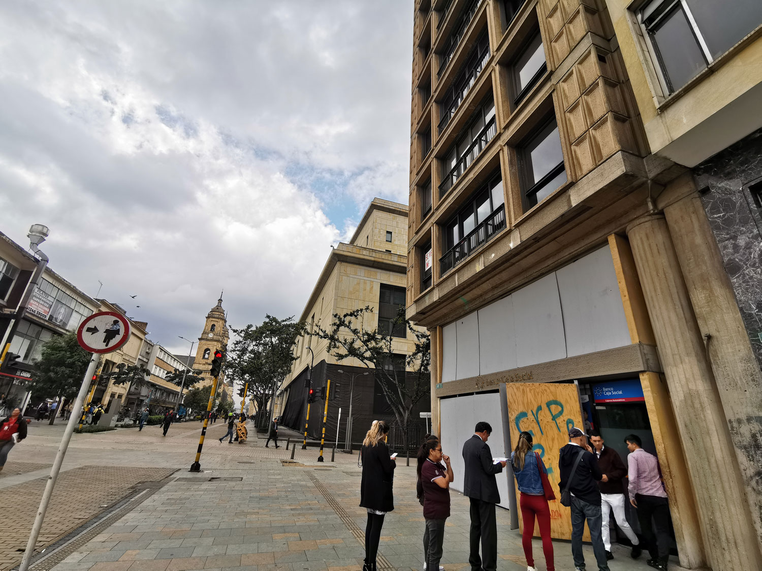 Solo un pequeño letrero del Banco Caja Social se puede ver luego de que los ventanales de la entidad fueran cubiertos desde esta semana.