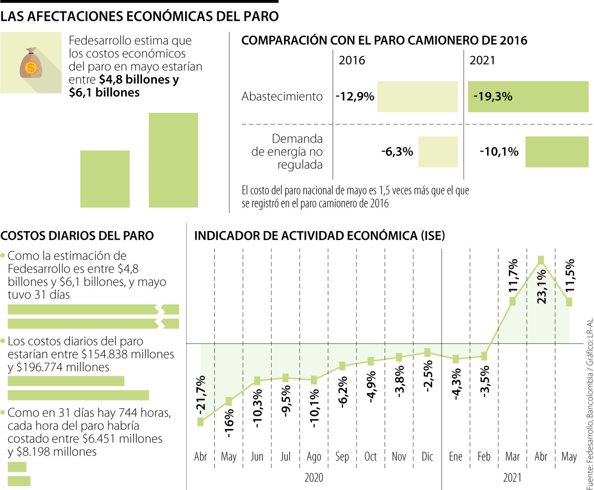 Con estas cifras y teniendo en cuenta que mayo tiene 31 días, LR calculó que los costos diarios del paro oscilaron entre $154.838 millones y $196.774 millones en el quinto mes del año.