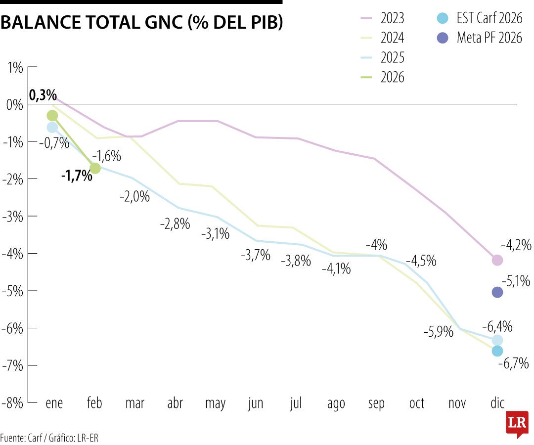 En su más reciente informe de seguimiento fiscal de abril, el Carf señala que esta tendencia se ha mantenido en lo corrido de 2026, con una mayor carga en la deuda interna. La entidad indicó que la deuda bruta como porcentaje del PIB aumentó 1,6 puntos porcentuales entre enero y febrero, hasta alcanzar 62% del PIB. Este incremento se explicó principalmente por un alza de 1,2 puntos porcentuales en la deuda interna, nuevamente asociada a la estrategia de emisión de nueva deuda.