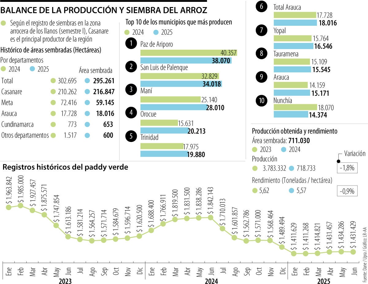 De hecho, el más reciente reporte de la encuesta de arroz mecanizado, que compila el área sembrada de la zona arrocera de los Llanos, con corte al primer semestre de 2025, revela que la siembra se extiende a 295.261 hectáreas, siendo Casanare el departamento con más área trabajada de la región con 216.847 hectáreas.