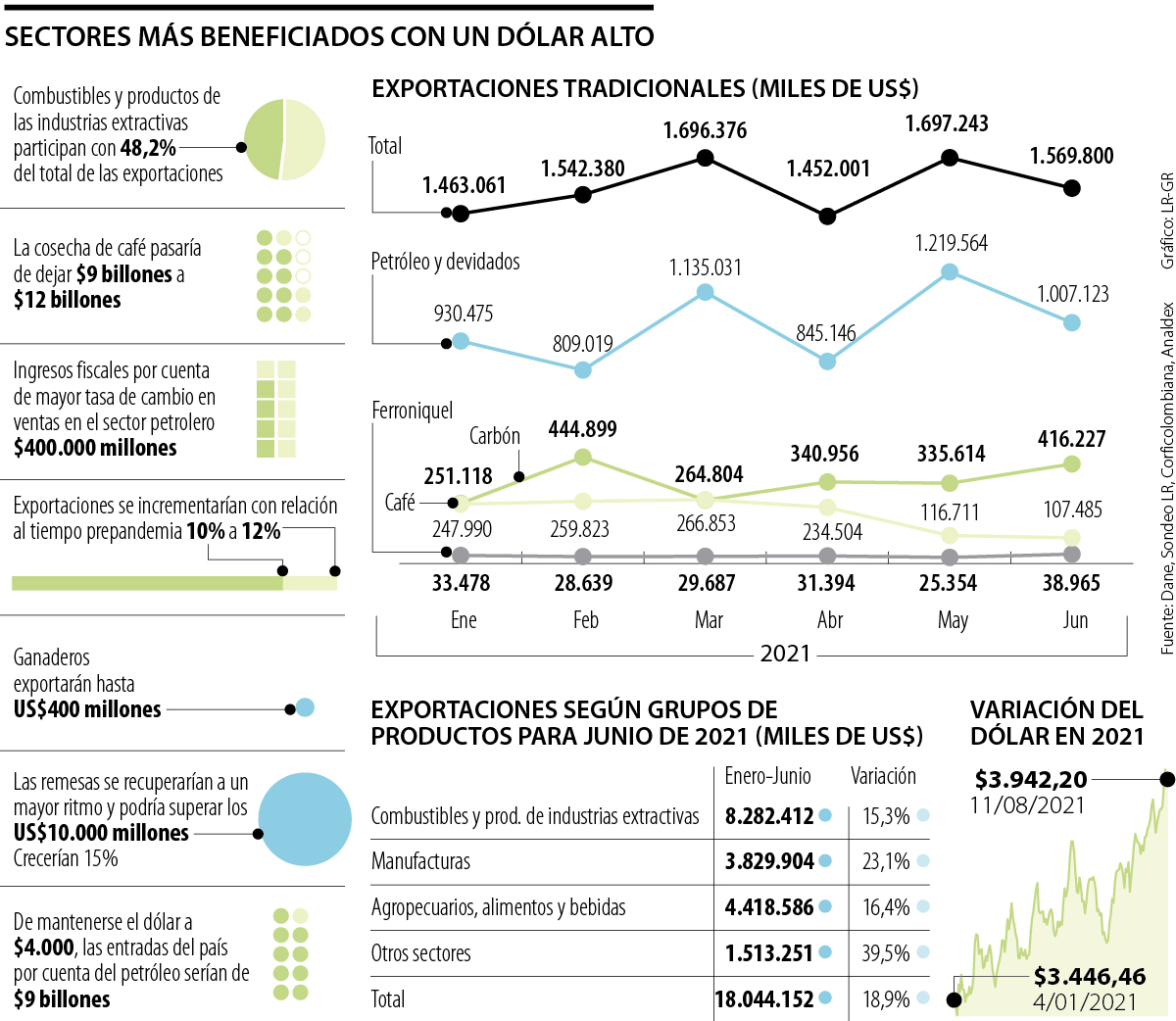 Punto en el que coincidió con José Luis Mojica, analista de investigaciones de Corficolombiana, ya que a su criterio, los grandes ganadores con las devaluaciones son los exportadores, aún más observando que la mayoría de materias primas han repuntado durante 2021.