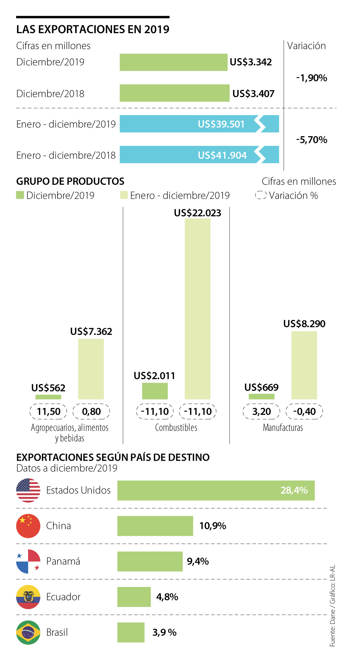 El único dato positivo que resaltó en el informe entregado por la entidad de estadística fue el del aumento consolidado de 2019 en el grupo de productos agropecuarios, alimentos y bebidas, los cuales se ubicaron en US$7.362,7 millones y mostraron un crecimiento de 0,8% frente al consolidado de 2o18. Este resultado estuvo explicado, principalmente, por el aumento en las ventas de aceite de soja, de café tostado y de la industria de bananas, que también incluye plátanos.