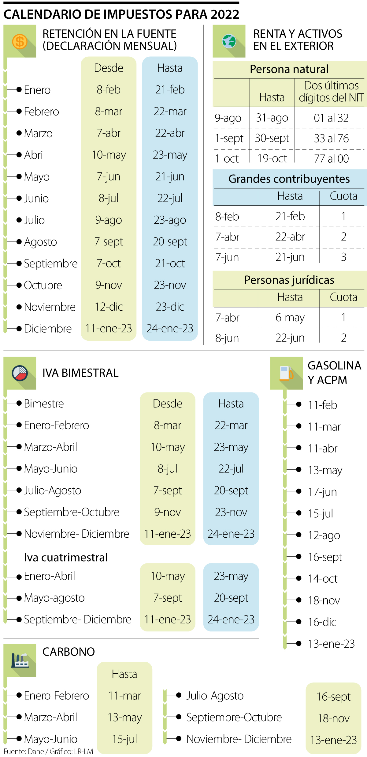 Con eso en mente, en 2022 ya se avecina un nuevo ciclo de pago de impuestos y, por lo tanto, LR hizo un recuento del calendario tributario para este año, de acuerdo con el Decreto 1778 de 2021.