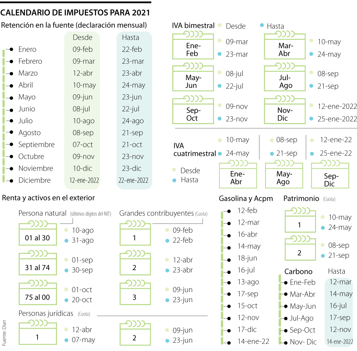 Por su parte, los calificados por la Dian como grandes contribuyentes deberán hacer el pago del impuesto de renta por el año gravable 2020 en tres cuotas. La primera entre el nueve y el 22 de febrero, la segunda entre el 12 y el 23 de abril y la tercera entre el nueve y el 23 de junio.