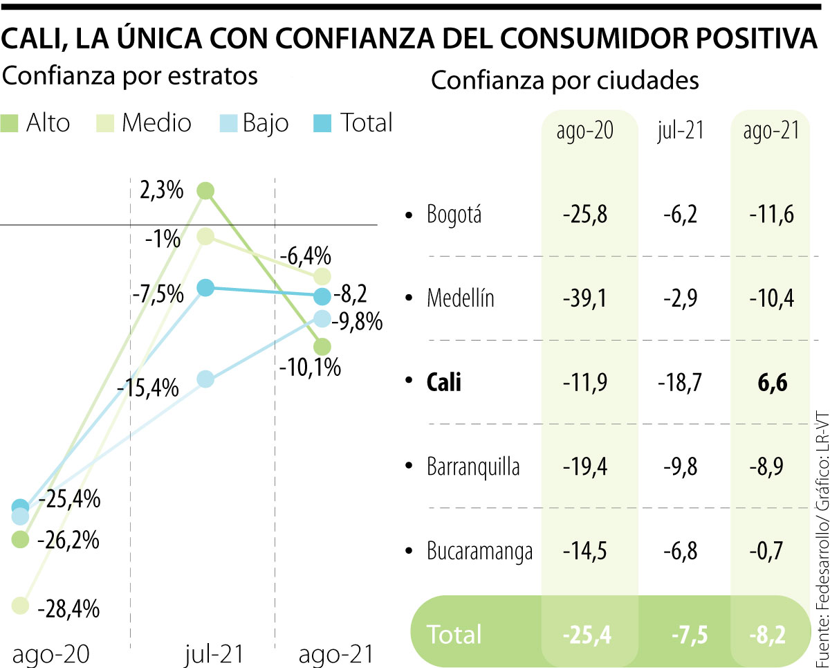 Después de los efectos negativos y estragos que se generaron en Cali producto del paro nacional y los bloqueos viales, que afectaron a la capital del Valle del Cauca durante el segundo trimestre, la confianza del consumidor se disparó en la ciudad en agosto y pasó a ser la única con indicador positivo en el país.