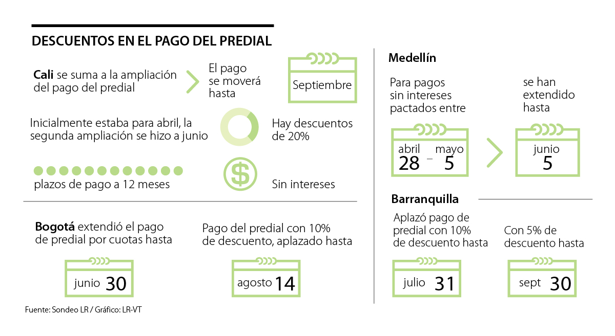 Bogotá fue una de las primeras en acogerse a un nuevo aplazamiento en los pagos del impuesto predial, ICA, entre otros, quedando finalmente pospuestos para agosto con descuentos de 20%. Esta decisión, que fue celebrada por los capitalinos, marcó el camino del resto de administraciones locales para dar una espera mayor a la liquidación de los tributos, teniendo en cuenta que el Gobierno amplió la cuarentena obligatoria.