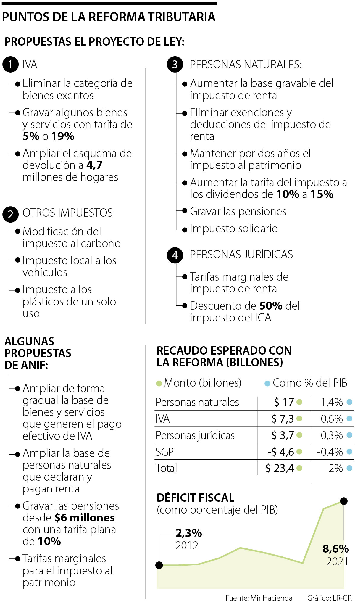 En específico, la asociación coincide en que existe la necesidad de ampliar la base de declarantes y contribuyentes del impuesto de renta. Aunque hay diferencias en los detalles de ambas propuestas, pues Anif propone que se empiece a pagar renta con ingresos brutos de $2,2 millones mensuales con tarifas marginales que irían de 5% a 40%, la asociación afirma que la propuesta del Gobierno hace más progresivo el sistema actual.