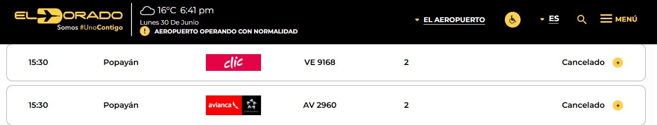 Además, varios vuelos presentaron cancelaciones con destino a Bogotá, como los provenientes de Montería (LATAM LA4207), Riohacha (Avianca AV8429), Popayán (Avianca AV4814), Madrid (Avianca AV11) y Barranquilla (LATAM LA4135). Algunas salidas desde Bogotá también se vieron afectadas, entre ellas las rutas hacia Popayán operadas por Clic (VE9168) y Avianca (AV2960).