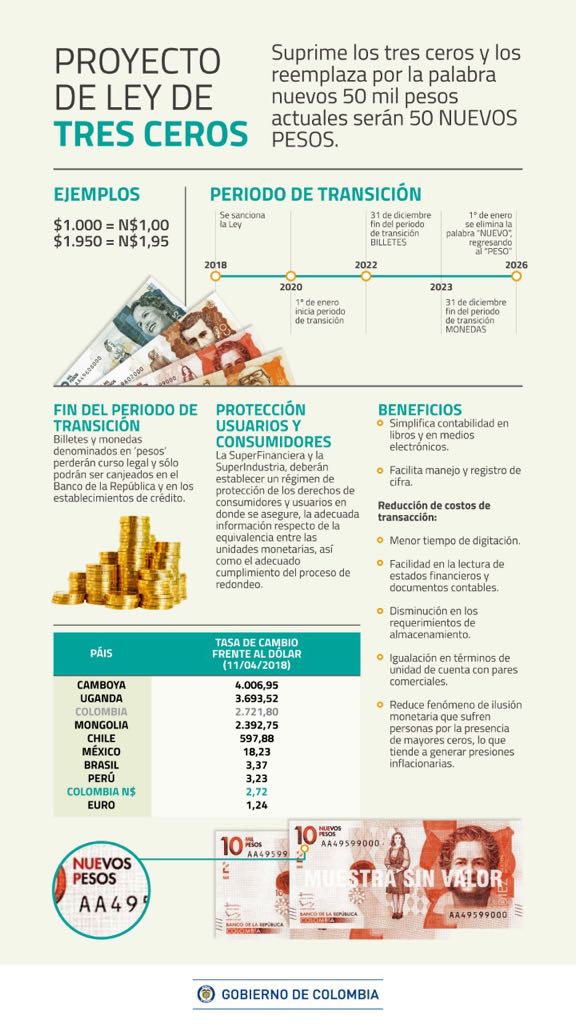 El pasado 24 de febrero, el ministro de Hacienda y Crédito Público, Mauricio Cárdenas, anunció el interés del Gobierno de revivir la propuesta de eliminar los tres ceros al peso colombiano, proyecto que fue presentado en tres ocasiones, en 2001, 2010 y 2016, y en todas ellas fue archivado antes de alcanzar una instancia de decisión.